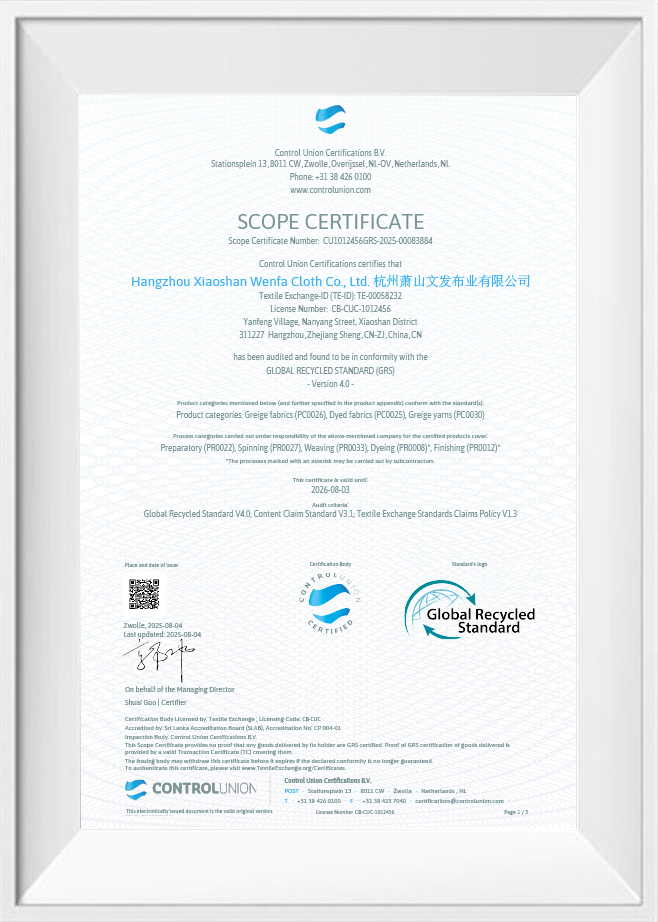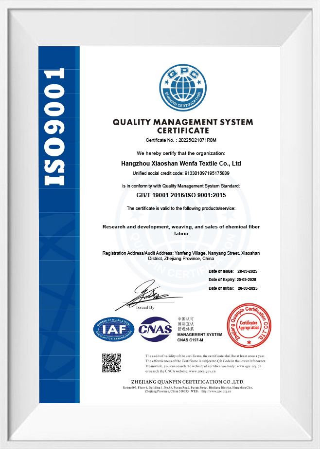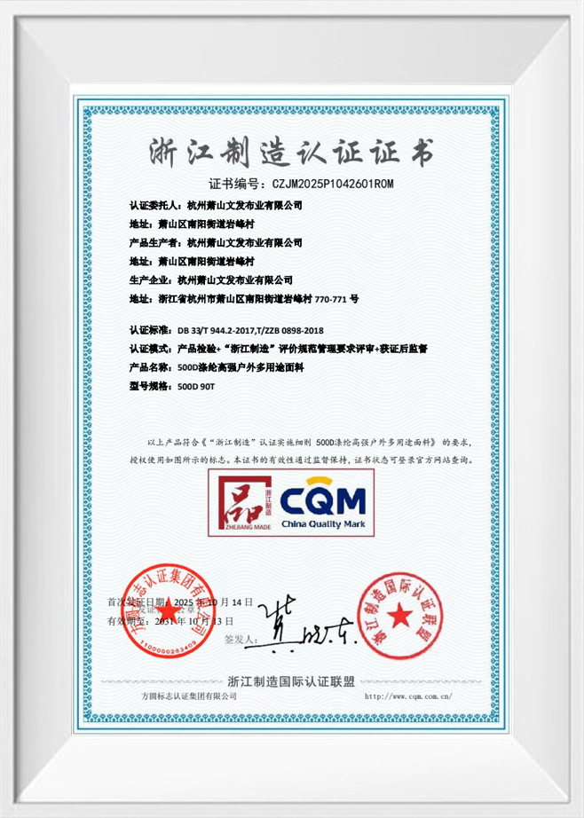 Wenfa Textile er ISO-sertifisert og oppfyller globale standarder som REACH, GRS og OBP, noe som sikrer at stoffene deres oppfyller strenge krav til kvalitet og bærekraft. Deres forpliktelse til kvalitet og innovasjon gjør dem til et foretrukket valg for bedrifter i ulike sektorer, inkludert bagasje, utendørsutstyr og barneprodukter.